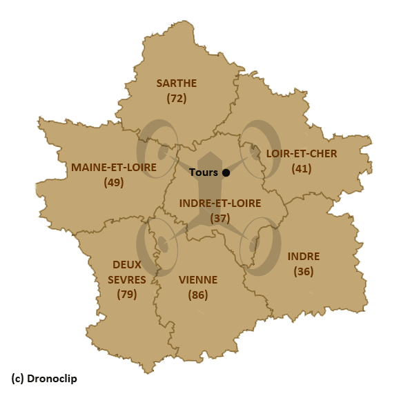 Je peux également intervenir sans frais de déplacement pour des photos aériennes par drone en Indre-et-Loire (37) autour des villes de Tours, Vouvray, Amboise, Chenonceaux, Orléans, Le Mans, Angers, Chateauroux, Azay-le-Rideau, Bourgueil ou Saumur.